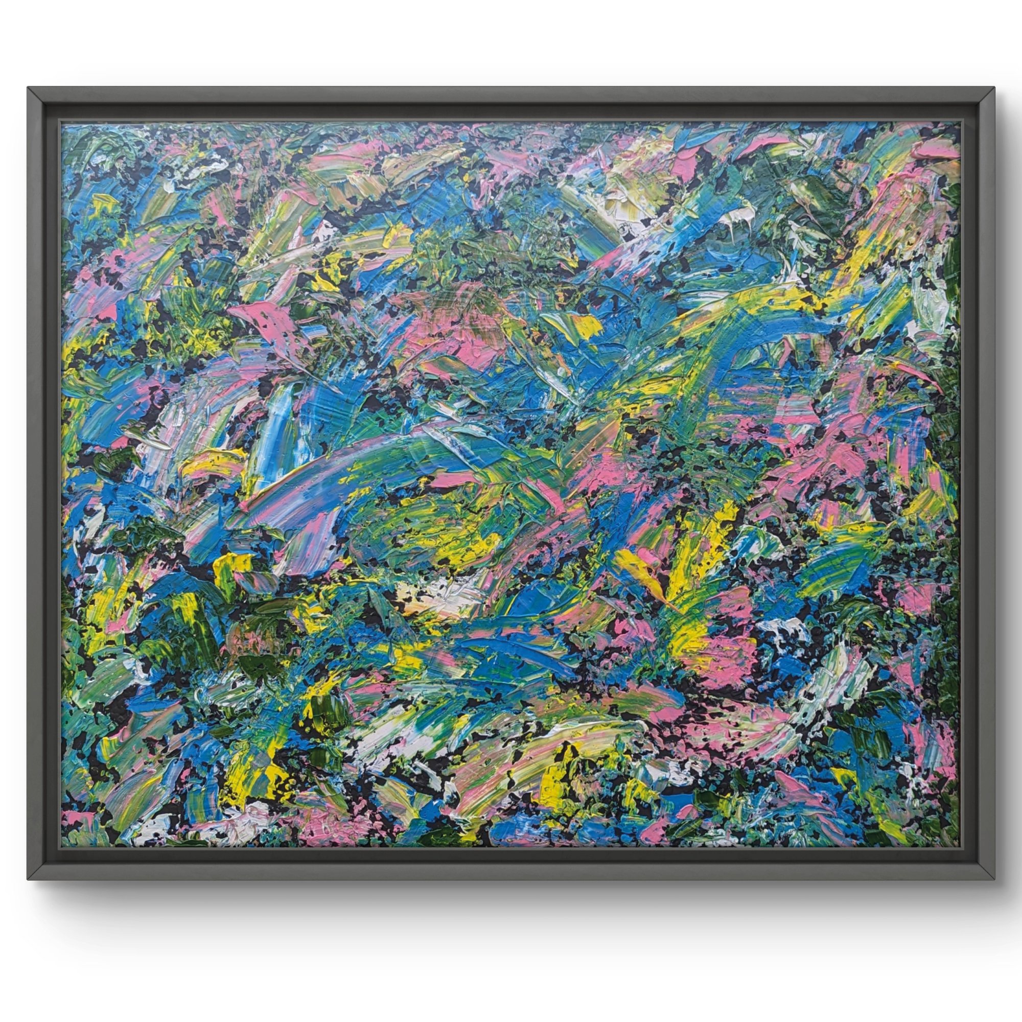 102 - 82 cms Oil on canvas with wax. Framed in a black canvas-edge frame 33mm deep. Signed and dated on the back.